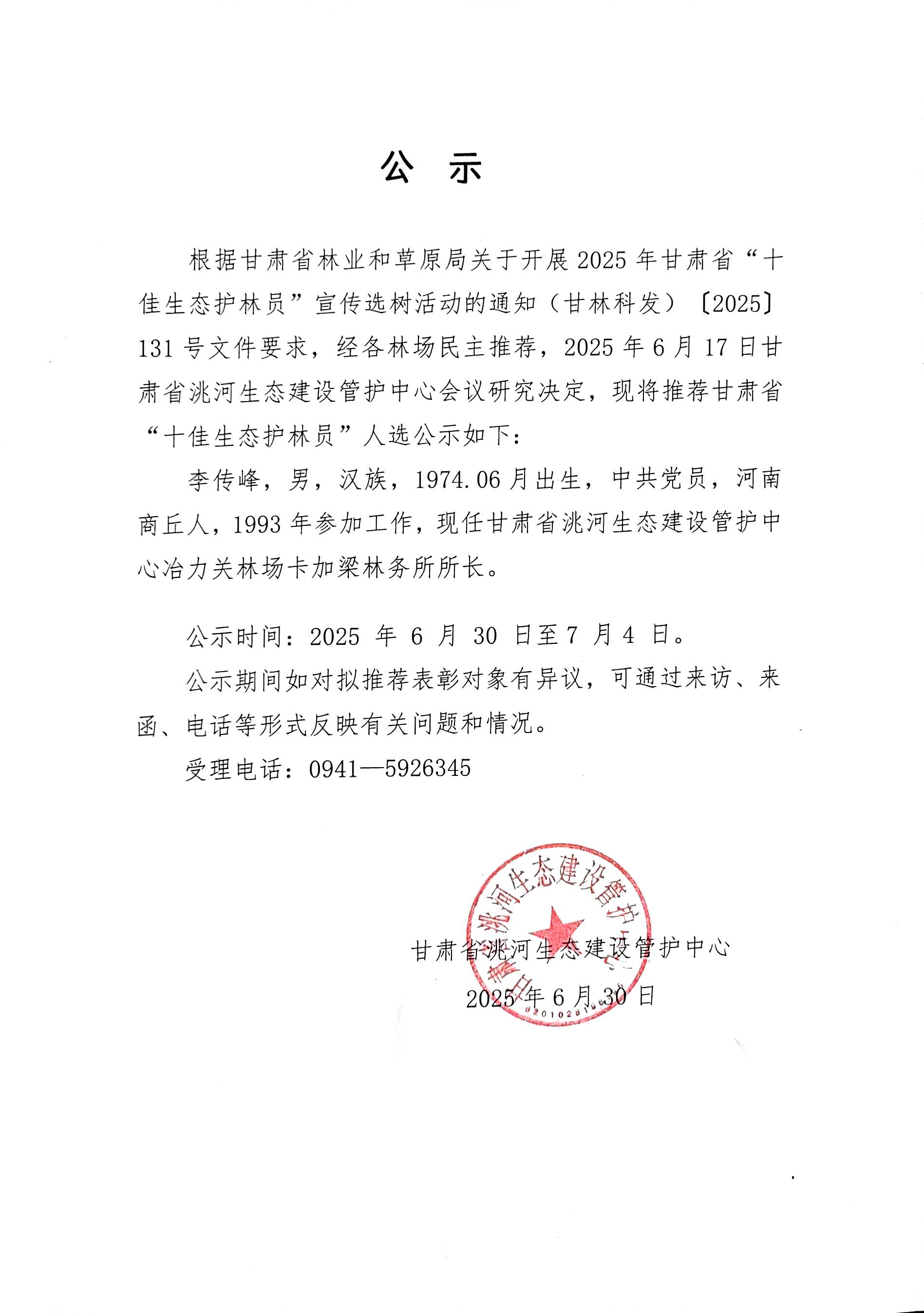 甘肃省洮河生态建设管护中心关于评选甘肃省“十佳生态护林员”的公示