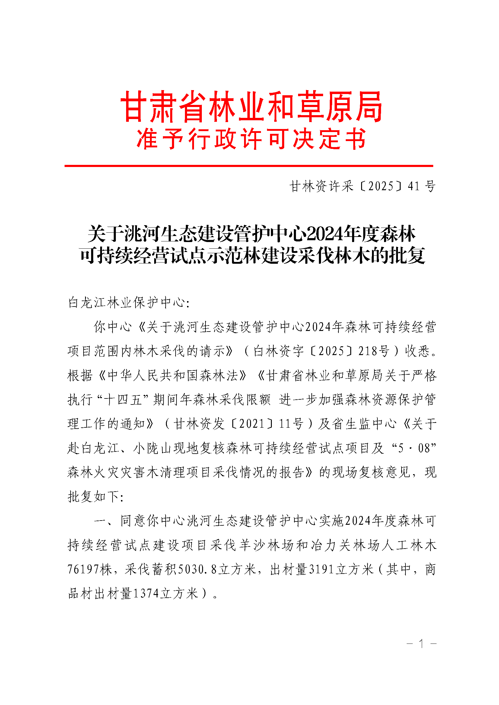 关于洮河生态建设管护中心2024年度森林可持续经营试点示范林建设采伐林木的批复
