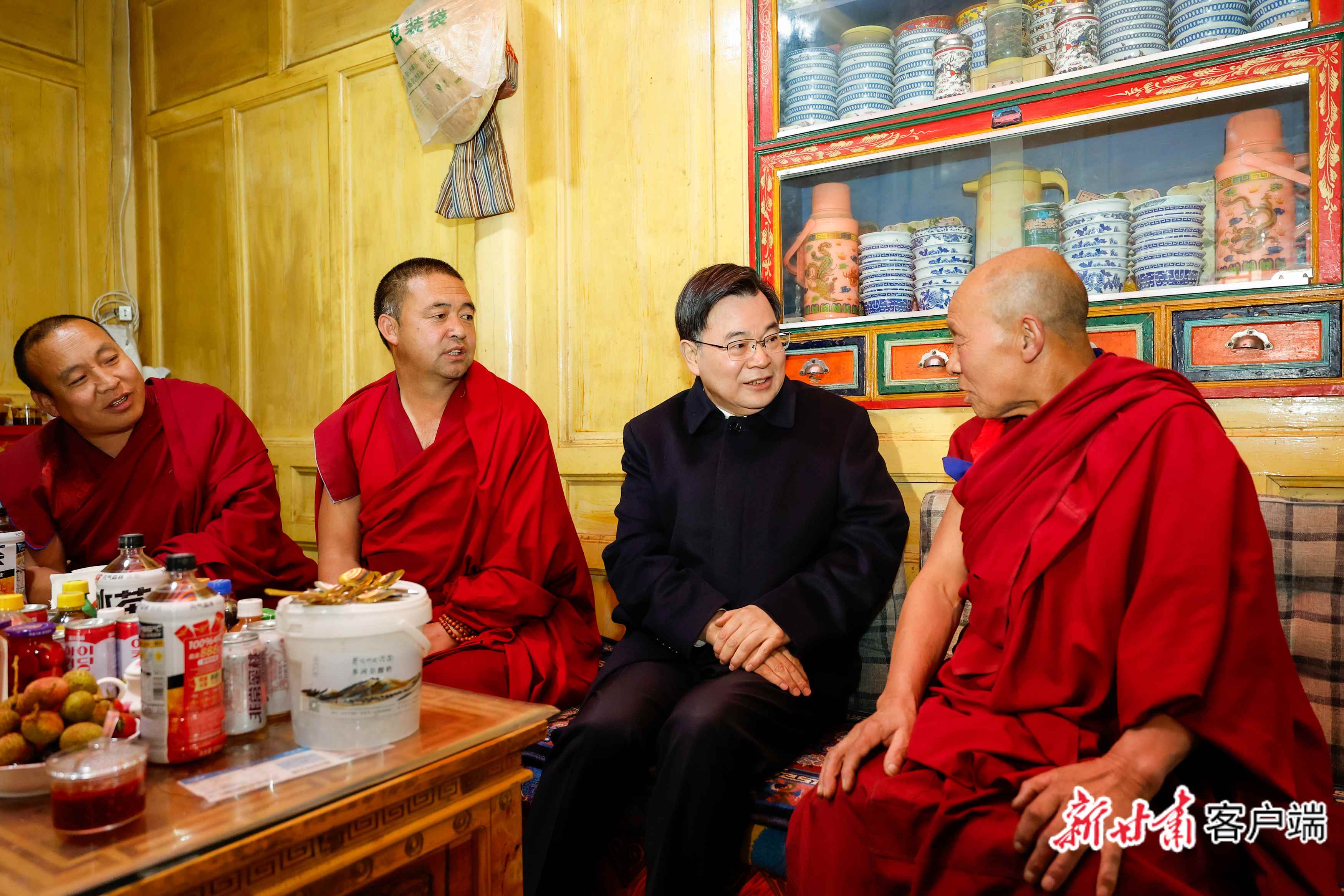 胡昌升来到多河寺、卡加曼寺,了解寺庙依法规范管理情况,同宗教界人士亲切交谈,并走访慰问困难僧人。他强调,要以铸牢中华民族共同体意识为主线,深入实施“石榴籽”教育工程,扎实开展国家意识、公民意识、法治意识学习教育,引导僧俗群众坚定不移听党话、跟党走。要坚持我国宗教中国化方向,依法加强宗教事务管理,健全完善管理制度,帮助寺庙和僧人解决实际困难问题,及时排查消除寺庙消防、地灾等安全隐患,促进民族团结进步事业发展。要用心用情做好群众工作,纵深推进“群众工作五个全覆盖”行动走深走实、落地见效,巩固和发展民族和睦、宗教和顺、社会和谐的良好局面。