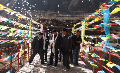 便民桥的架通,对尖藏村民来说是一件喜事。桥两边的护栏上挂满了经幡和彩旗,洁白的哈达随风飘舞;鞭炮和烟花放过后,很多村民在桥上抛撒象征吉祥平安的龙达。村主任赵沙布交为参加庆典的来宾敬献了哈达。他恭敬地双手托着哈达,对闵举东说,你们为全村和村民做了很多事情,村民经过这座桥,会常常想起这是林业局为我们修建的,太感谢林业局的支持和帮助。闵举东说,林业局是尖藏村的“双联”单位,我们是一家人,以后还会尽力去做,大家都一起出主意相办法,共同发展。
