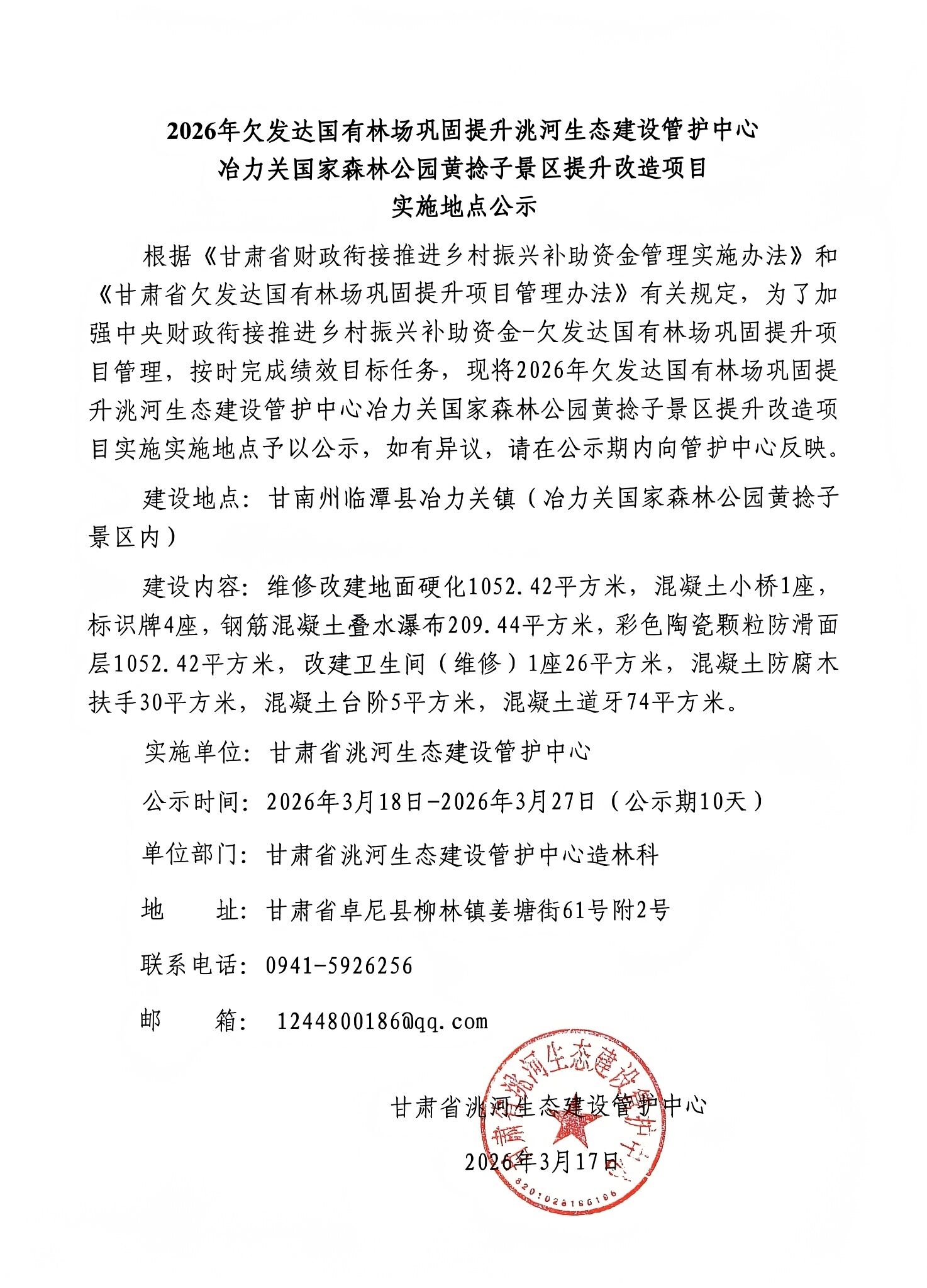 2026年欠发达国有林场巩固提升甘肃省洮河生态建设管护中心冶力关国家森林公园黄捻子景区提升改造项目实施地点公示。