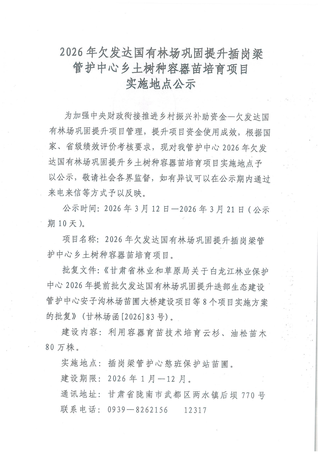 2026年欠发达国有林场巩固提升插岗梁 管护中心乡土树种容器苗培育项目 实施地点公示