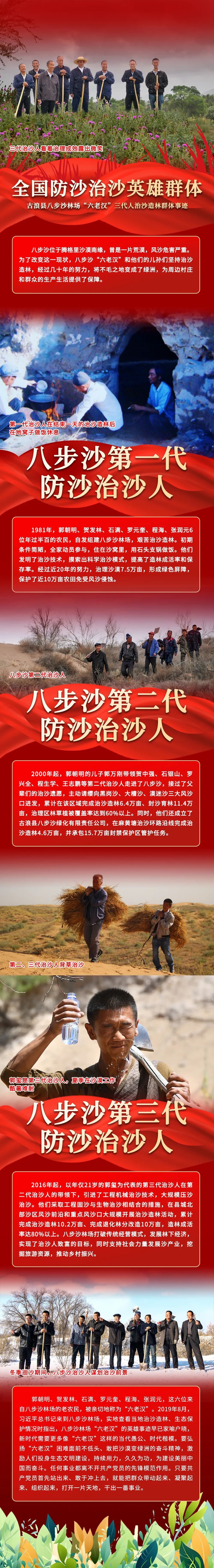 今天为您介绍八步沙林场“六老汉”三代人治沙造林群体的先进事迹。让我们认真学习、大力弘扬防沙治沙英模的先进事迹,为创造新时代中国防沙治沙新奇迹、加快推进人与自然和谐共生的现代化作出新的更大贡献。